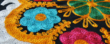 Suzani is a type of embroidered and decorative tribal textile made in Tajikistan, Uzbekistan, Kazakhstan and other Central Asiancountries. Suzani is from the Persian سوزن Suzan which means needle. The art of making such textiles in Iran is called سوزندوزیSuzandozi (needlework).